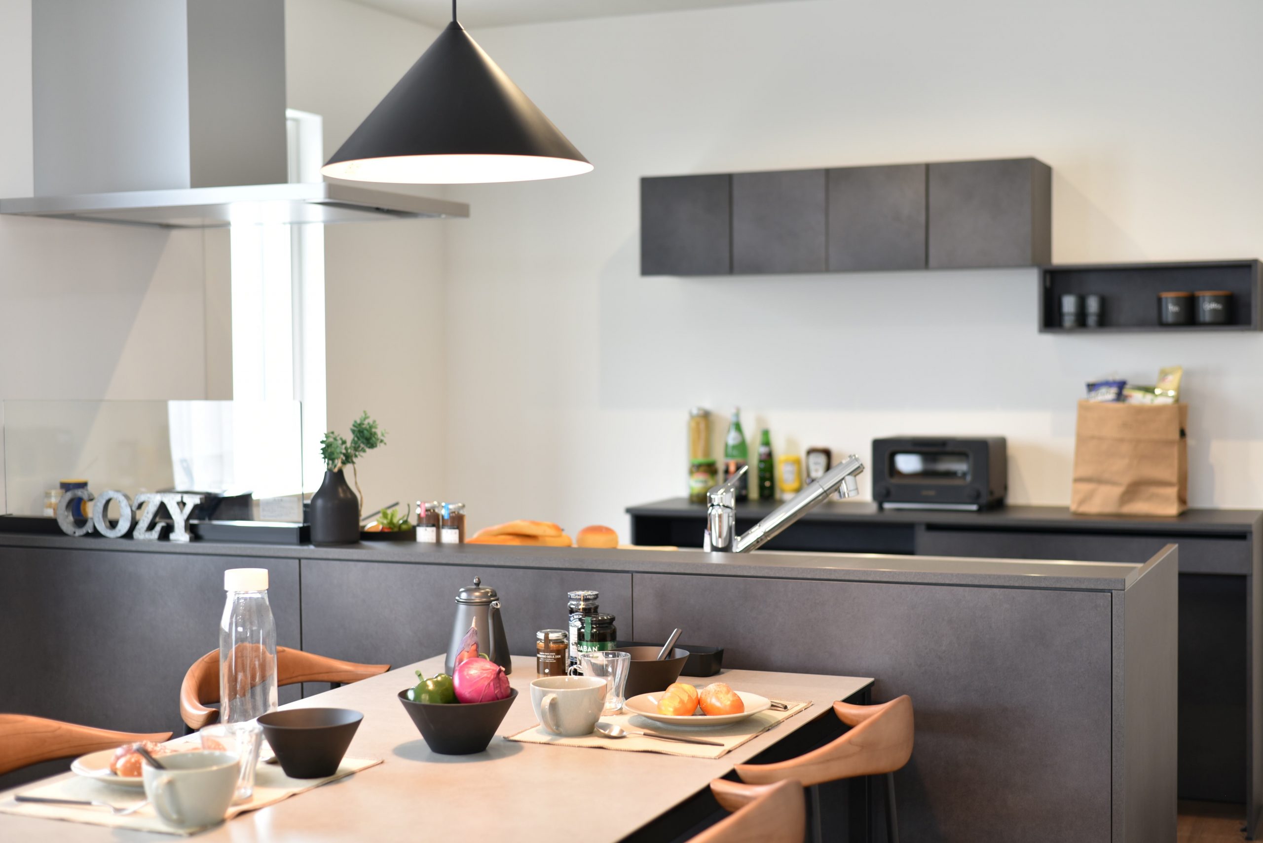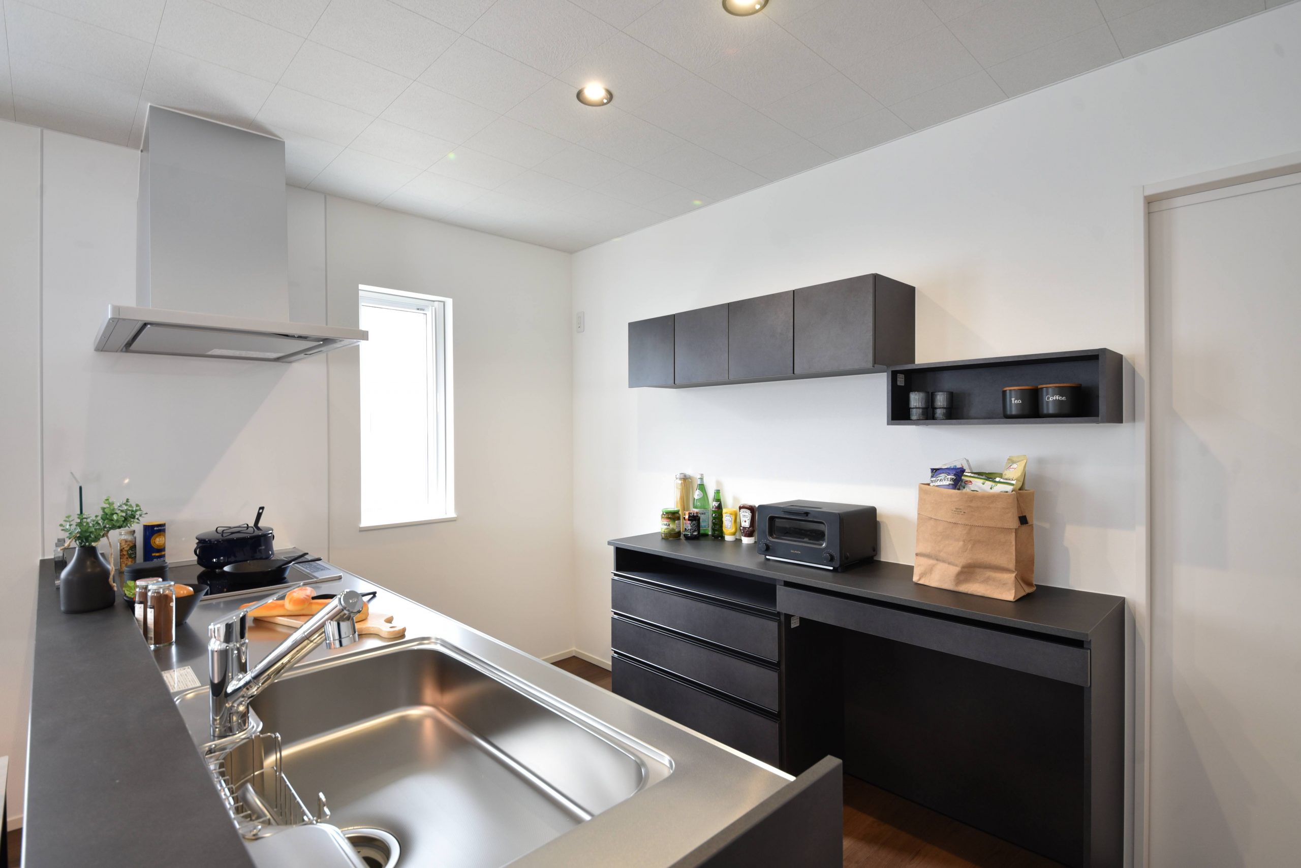「絶対にエスプレッソテイストのモデルハウスを建ててデュアルトップ対面のチャコールの面材を使うんだ」