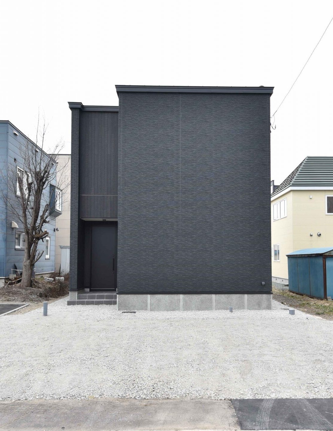 外壁も質感の異なる黒系の外壁で貼り分けたり、玄関ドアもマットブラックにしてみたり