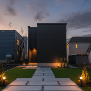 外観からシックな感じのイメージになるように間取りも含め窓の配置を変えたり、全体的に黒系の色でまとめましたが素材感の異なる黒を数種類使用しております。