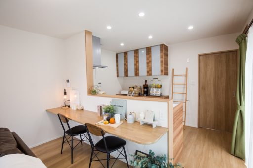 ダイニングテーブルをあえて置かず、カウンターで食事・勉強・作業が完結。
