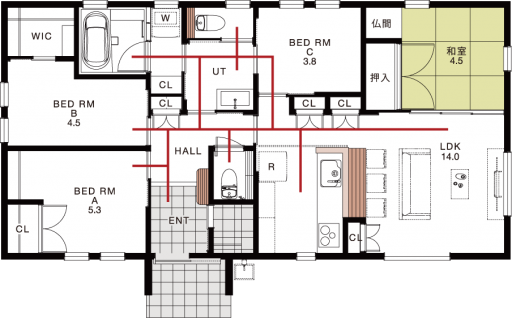 WIC・各居室のCL・和室の押入など、「片付けたい場所に収納がある」ストレスのない間取り。