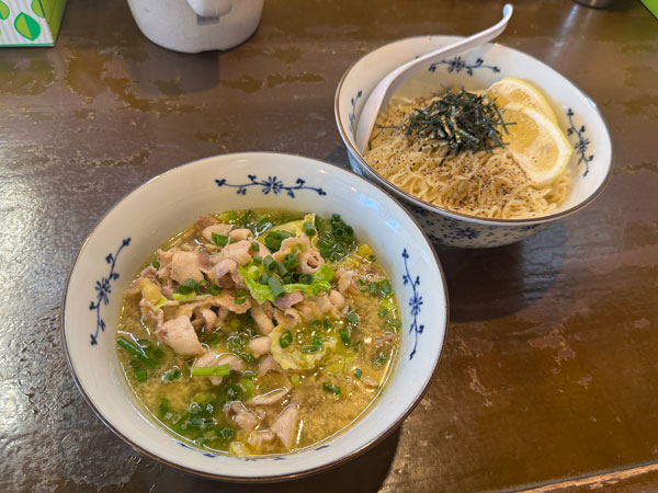 塩ベースのつけ汁にはかしわとキャベツとニラ。