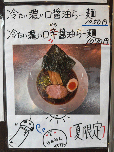 「冷やしラーメン」「冷たい濃い口醤油らー麺」