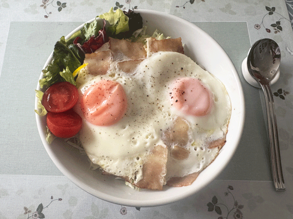ベーコンの下にはキャベツがタップリ!