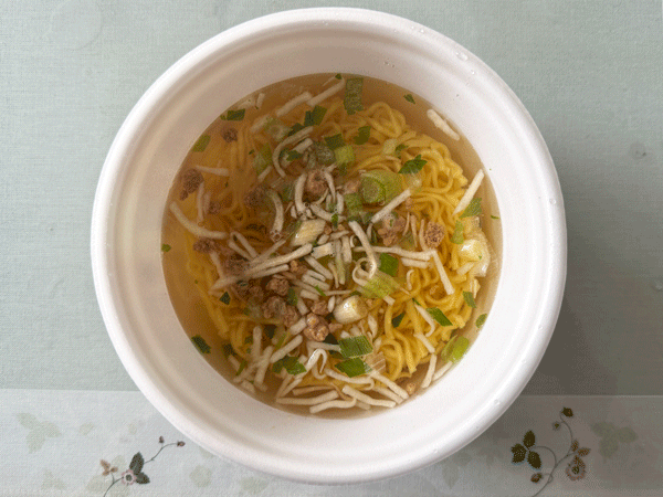 かやくを入れて熱湯5分、蓋を開けるとこんな感じ。