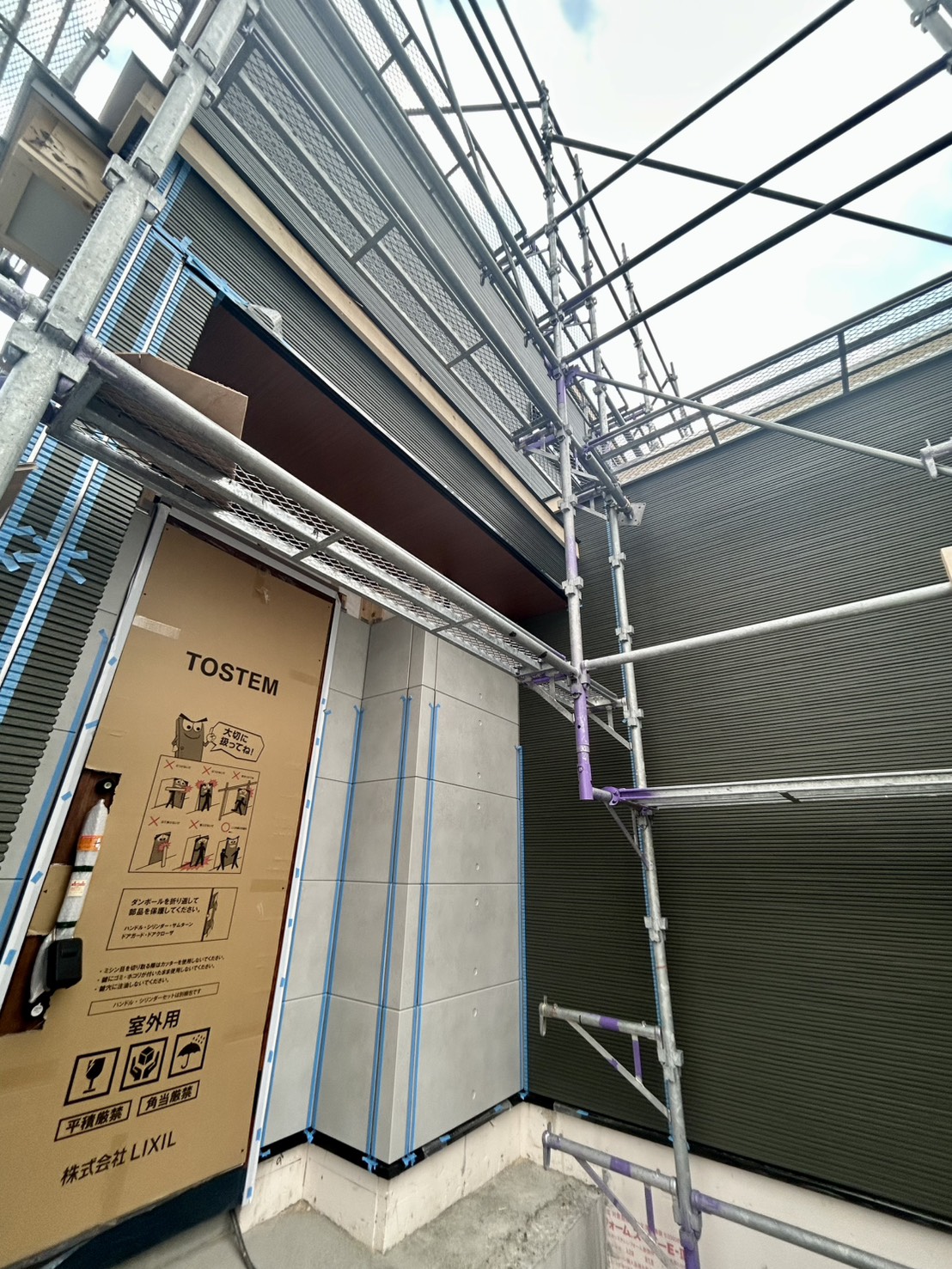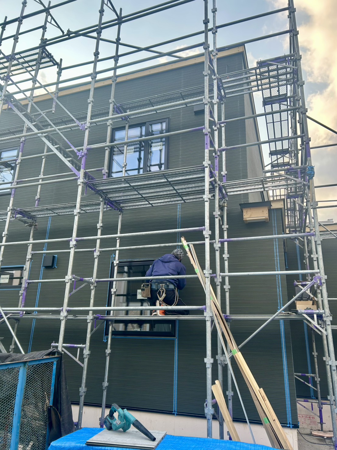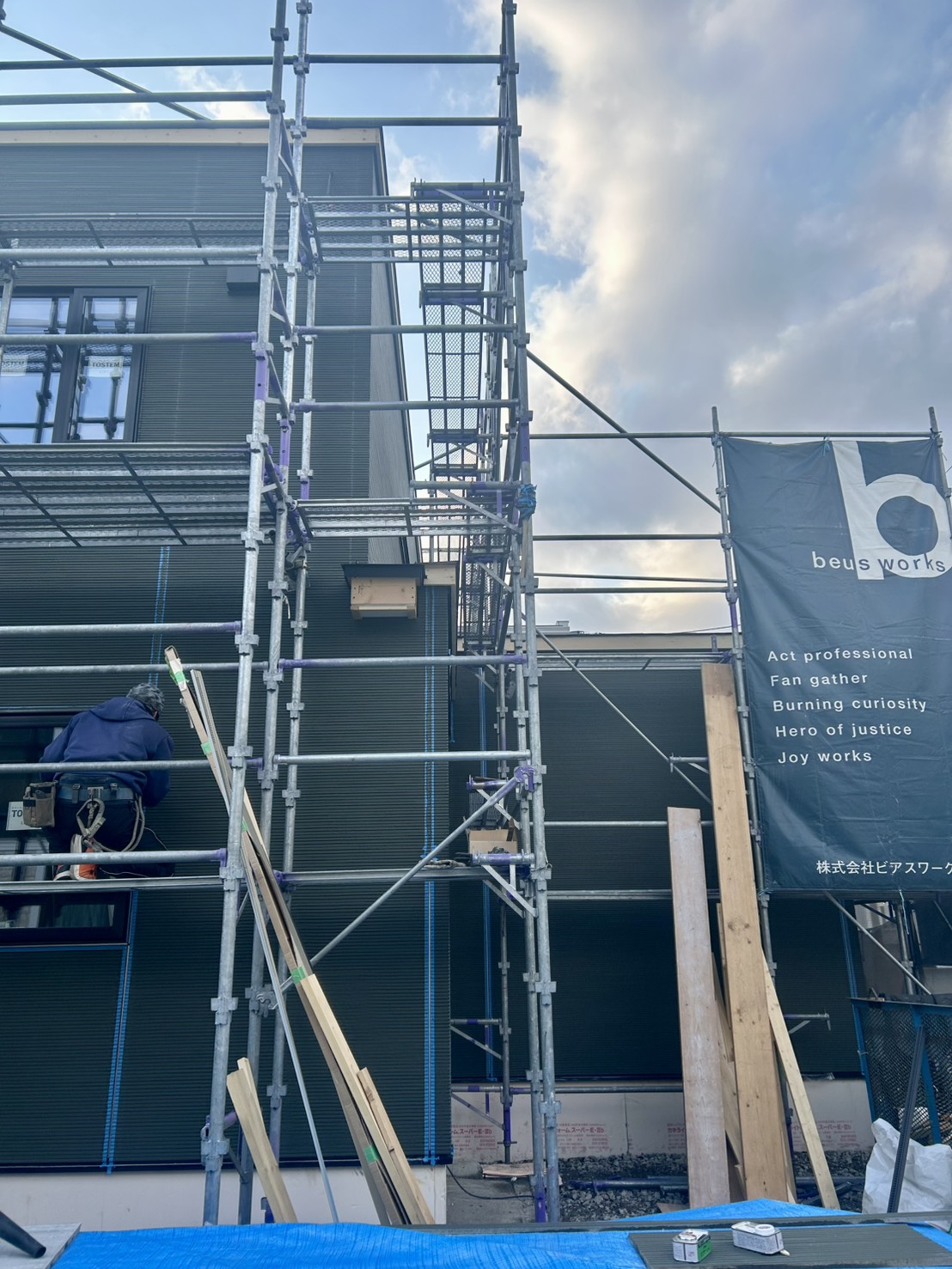 さて建築中の現場では、いよいよ外壁の施工が始まりました。