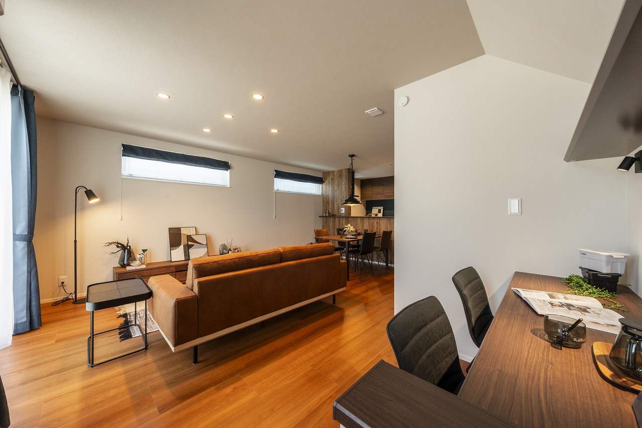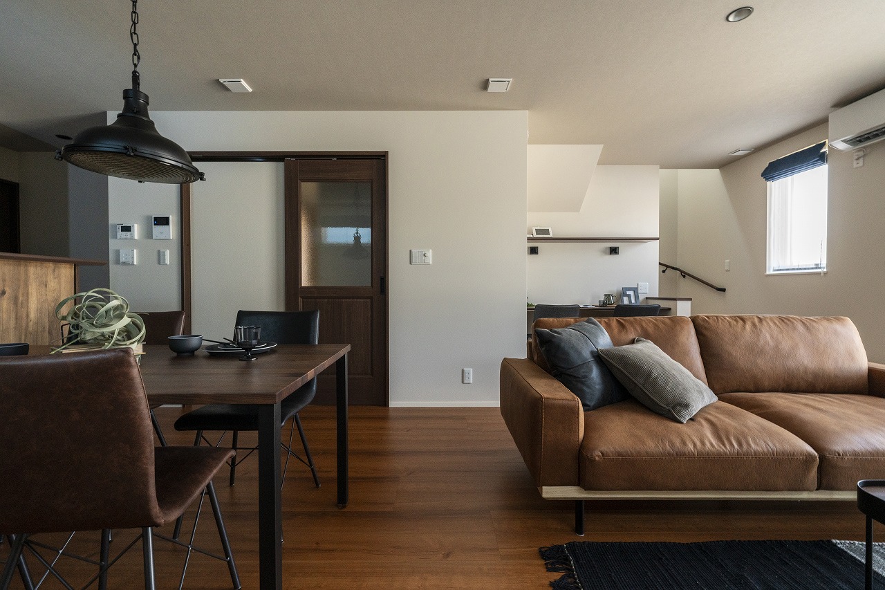 木のぬくもりを感じるフローリングや、ブラックのアイアン素材をアクセントに取り入れた照明など、「シンプルだけどかっこいい」空間が広がる住まい。