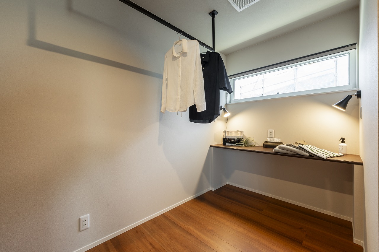 コンパクトながらもカウンターが備え付けられており、アイロンがけや洗濯物のたたみ作業、ちょっとした手仕事にもぴったり。子どもが宿題をしたり、趣味の時間に使ったりと、家族の数だけ活用方法が広がる“+α”の空間です。
