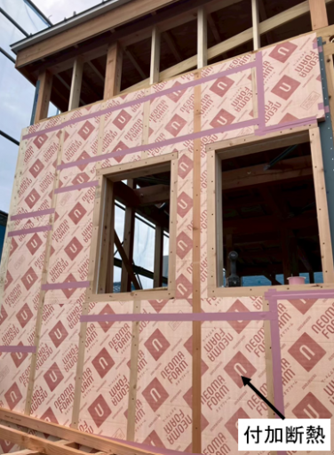 通常の「充填断熱」に加えて、壁の外側にも断熱材を追加する工法。
